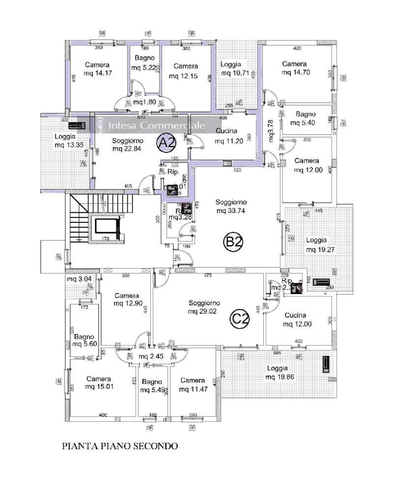 Soluzione al piano secondo e ultimo Tipologia A2 : Luminoso trilocale composto da soggiorno con loggia di 13 mq, cucina abitabile con loggia di mq 11, 2 camere, bagno, ripostiglio, disimpegno, box 283.000